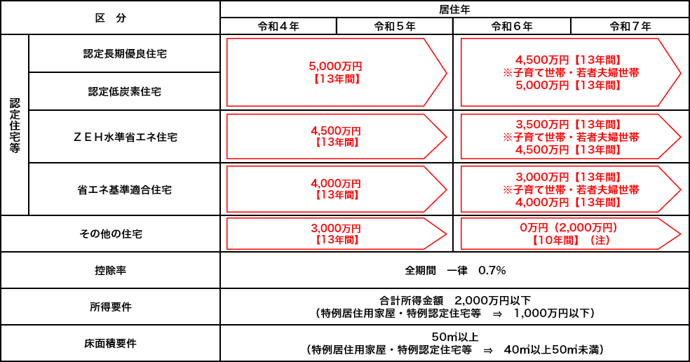 | 借入限度額 改正後 子育て世帯 | 5,000万円 | 4,500万円 | 4,000万円 |